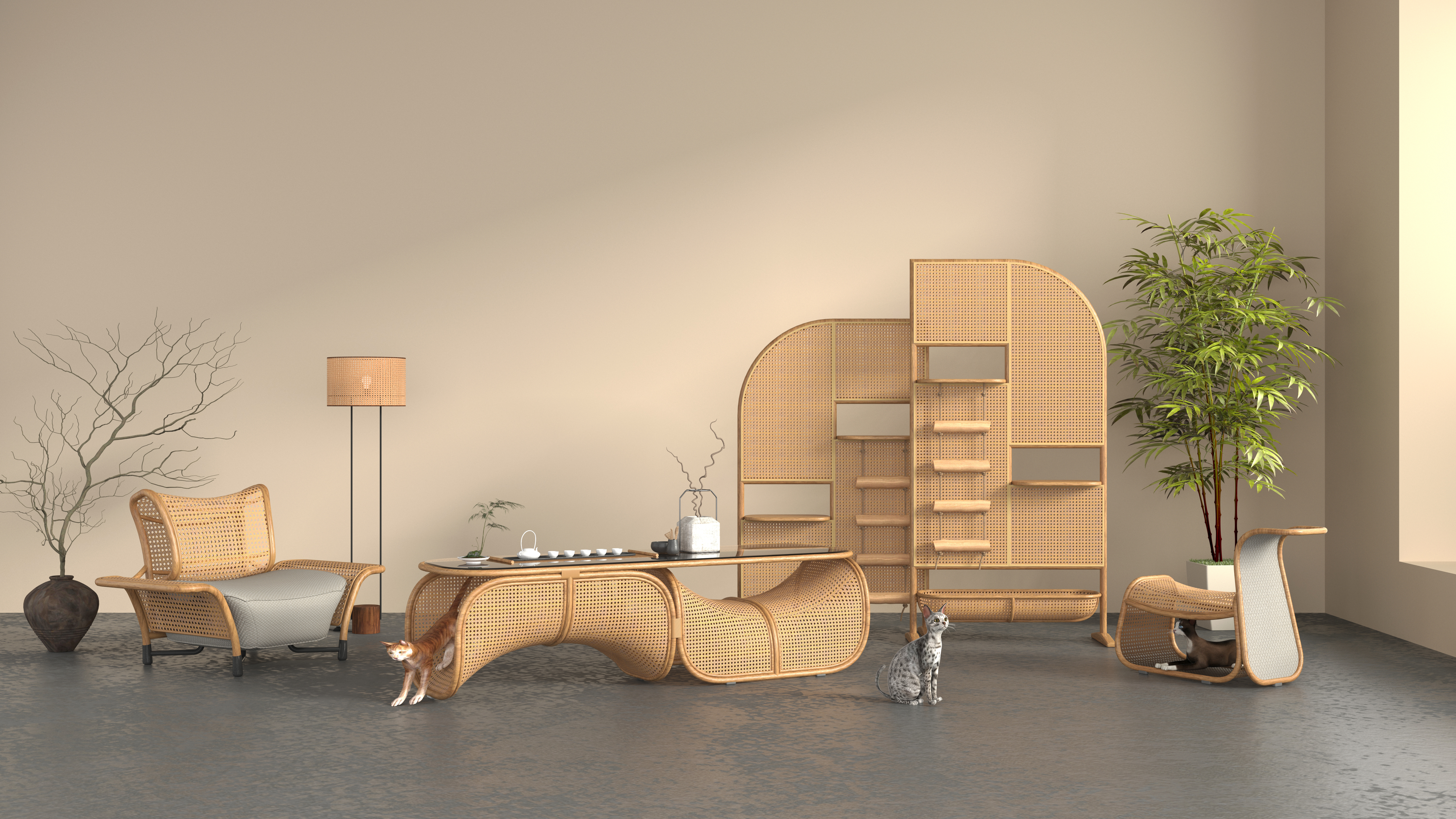 《猫悦》是一套人猫互动藤编家具,灵感来源于马鞍的造型。旨在提取马鞍优美的弧度融入人猫家具设计中,巧妙地解决了人猫家具中宠物猫的活动空间设计问题,例如茶几的底部设计由两个形状相同但方向相反的马鞍形部件组成,形成了一条非常适合宠物猫活动的隧道。材质选择天然藤条与塑料藤编的结合,同时融入猫抓板、玻璃、金属等材质。圆润的弧度设计与材质搭配不仅满足了宠物猫的爬、跳、钻、抓等需求,也满足了人的舒适度需求和情感需求。