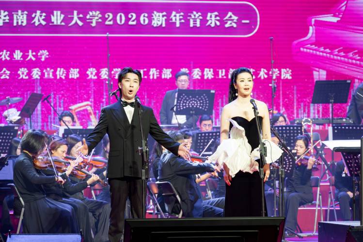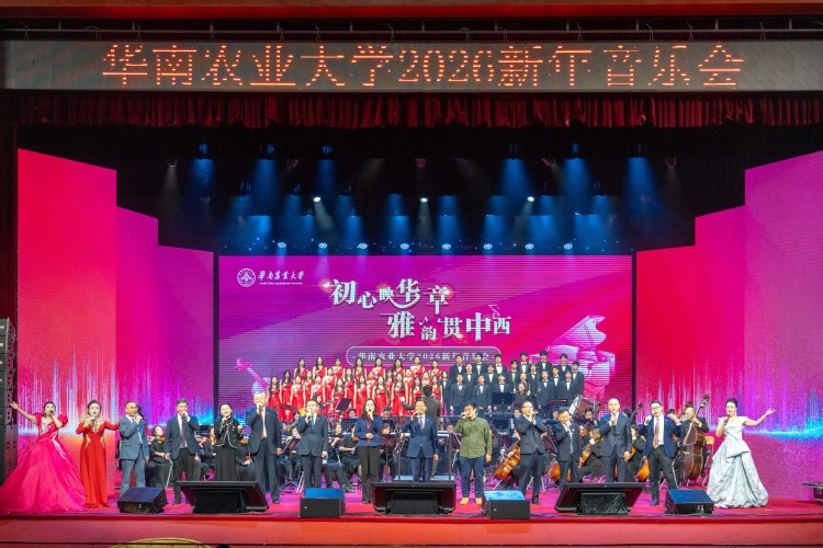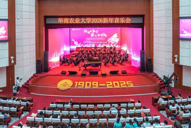 12月30日晚,丁颖礼堂内流光溢彩,华南农业大学“初心映华章 雅韵贯中西”2026年新年音乐会精彩上演。华农师生携手广州岭南交响乐团带来一场中西交融的艺术盛宴,音乐会同步在华农官方视频号、南方都市报平台直播,近3万人在线收看。