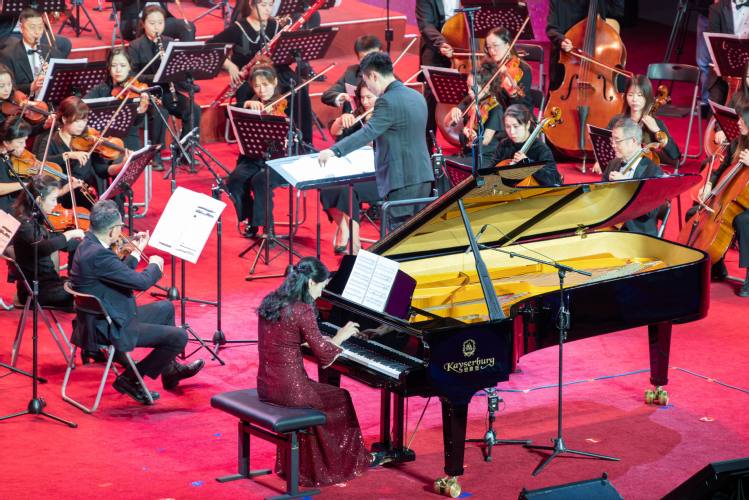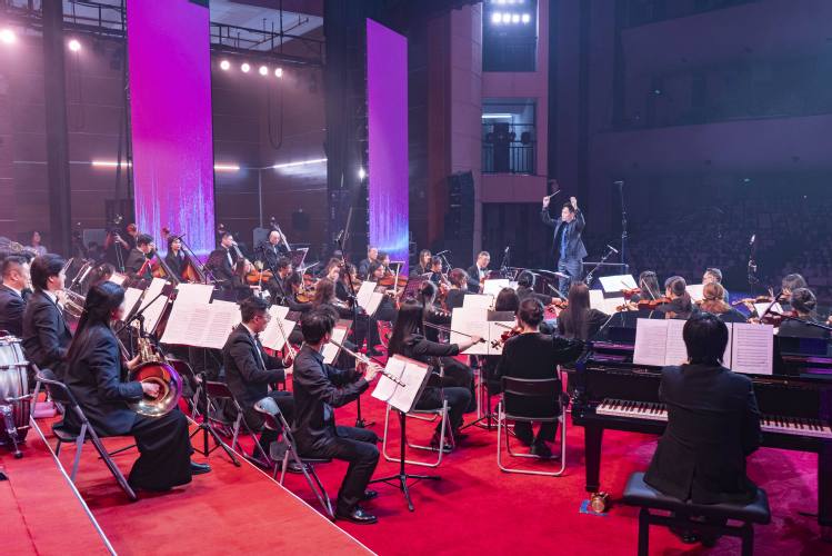 琴起如潮,乐涌成风,《红旗颂》的旋律响起,拉开新年音乐会的序幕。本场音乐会以“初心”为魂,以“雅韵”为骨,既有《红色娘子军》《不忘初心》的红色精神传承,也有《西关小姐》《彩云追月》中的岭南意韵,还有《第二圆舞曲》《雷电波尔卡》等西洋经典演绎,并特别带来《春节序曲》,平添新年暖意,跨域古今、融通中外。演出最后,校领导、高层次人才教师代表与艺术学院教师联袂献唱《歌唱祖国》,表达对祖国的真挚情感,激昂澎湃的旋律凝聚奋进力量,将整场音乐会推向高潮。