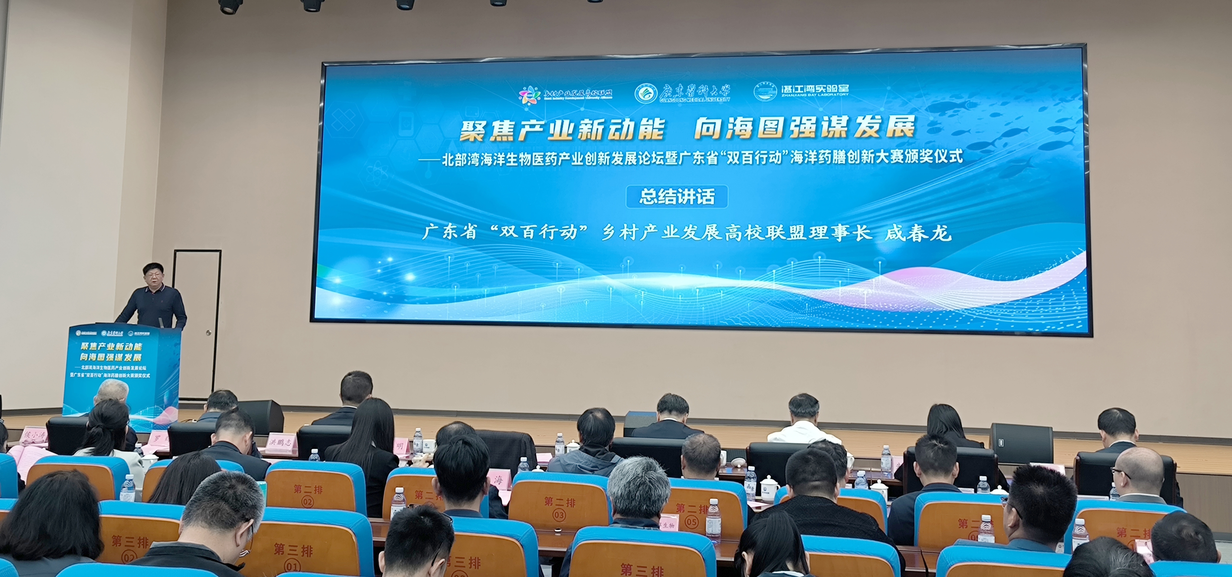 1月17日,北部湾海洋生物医药产业创新发展论坛暨广东省“双百行动”海洋药膳创新大赛在湛江湾实验室举行。广东省“双百行动”乡村产业发展高校联盟理事长、学校原副校长咸春龙教授出席活动并致辞。