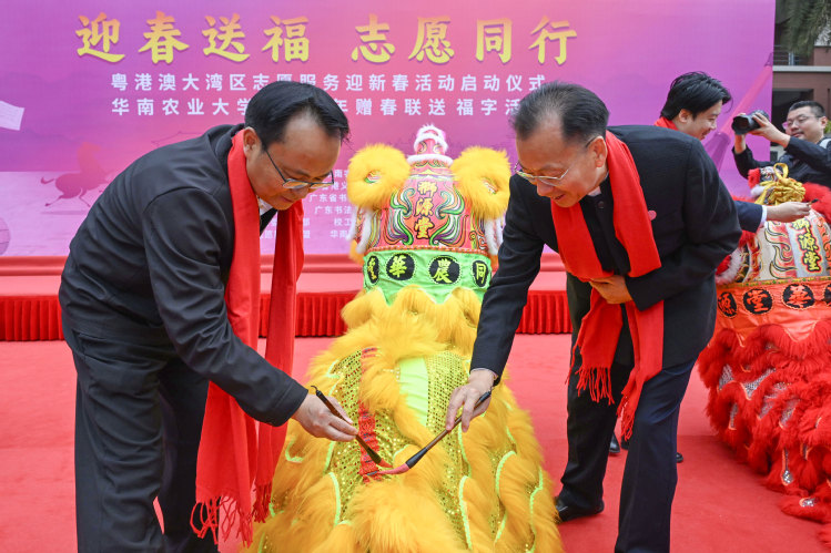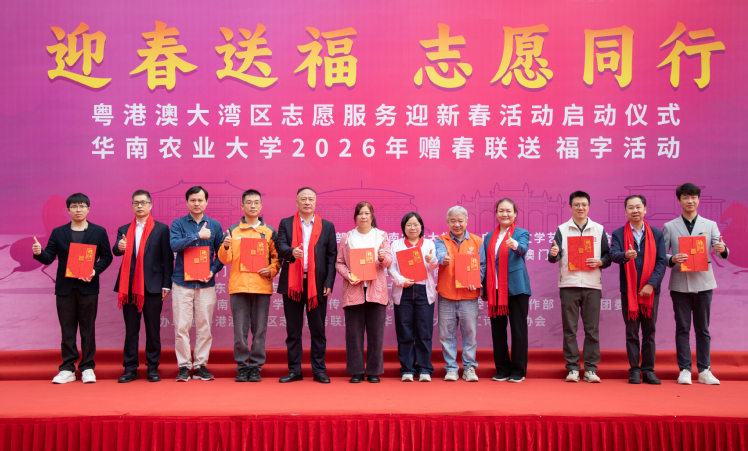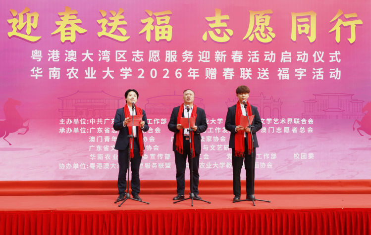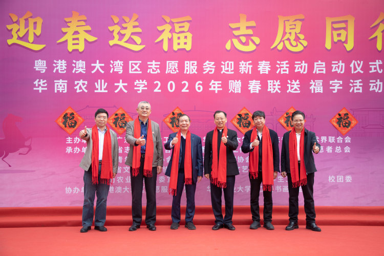 1月20日,“迎春送福,志愿同行”粤港澳大湾区志愿服务迎新春暨华南农业大学2026年赠春联送福字活动在行政楼广场举行,书法名家、粤港澳三地志愿服务代表及华农师生齐聚一堂,以志愿之名传温暖,以笔墨书香迎佳节,共同奏响大湾区志愿服务协同发展的新春序曲。