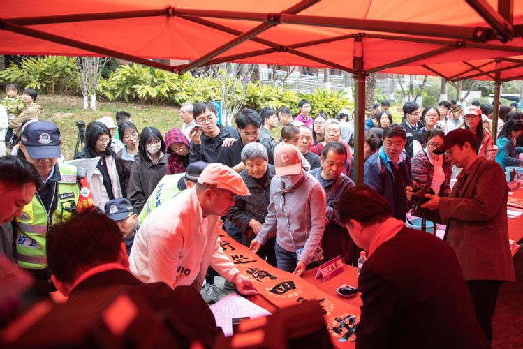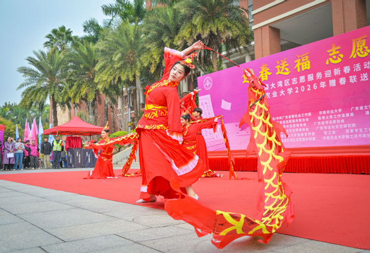 醒狮献瑞点睛,嘉宾同台开笔,书法摊位前,不少热情的师生市民已在排队等候。书法家及书法爱好者组成的志愿团队,摆开笔墨纸砚,现场挥毫。“龙腾四海歌盛世,春满湾区福临门”“志愿服务暖人心,同心共筑中国梦”等一副副寓意吉祥、饱含深情的春联,伴随着墨香送到师生市民手中,一大批提前精心准备的书法作品同步发放。舞台上,歌舞、民乐演奏等迎春节目轮番上演,与书写现场的热闹景象相映成趣,营造出喜庆祥和的节日氛围。