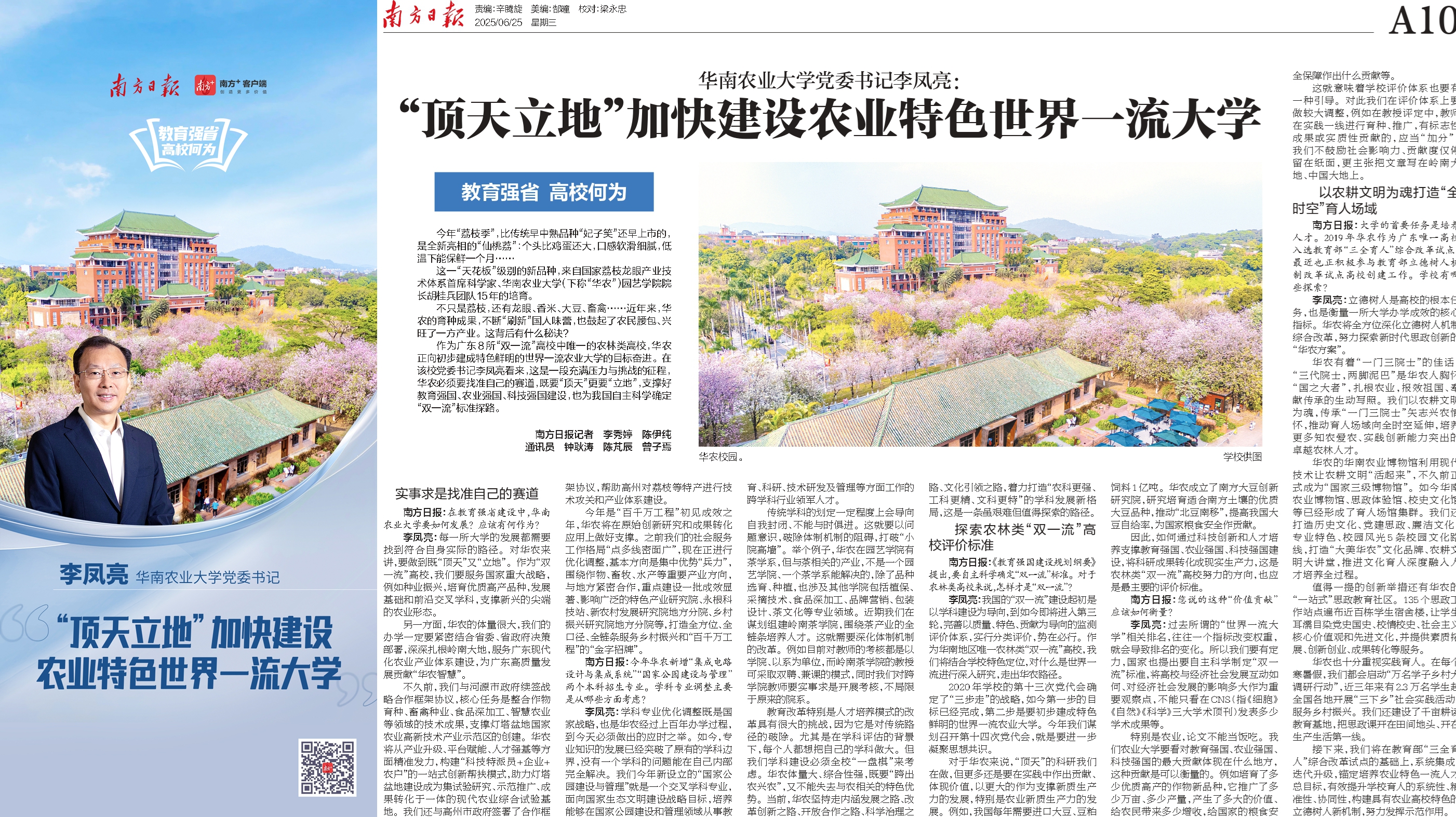 内聚人心,外塑形象。全年在国家级、省级等主流媒体发布相关报道1400余篇,其中,《南方日报》专访李凤亮书记《“顶天立地”加快建设农业特色世界一流大学》,作为“教育强国 高校何为”专栏开栏报道;新华网、南方都市报专访薛红卫校长畅谈“双一流”建设高校办学经验。以服务区域发展为契机,邀请新华社、中国日报等主流媒体赴茂名荔枝产业一线调研报道学校技术攻关成果,《南方日报》特刊整版聚焦学校服务“百千万工程”实践;在《中国日报》《科技日报》策划作物学科专题宣传。学校在全国高校网络育人能力提升专题研修班分享经验,联合中国教育在线主办华南高校宣传部研讨会。以学校参与举办十五运会和残特奥会相关赛事为契机,讲好赛场内外的华农故事,主流媒体发布报道3000余篇次,显著提升学校美誉度。