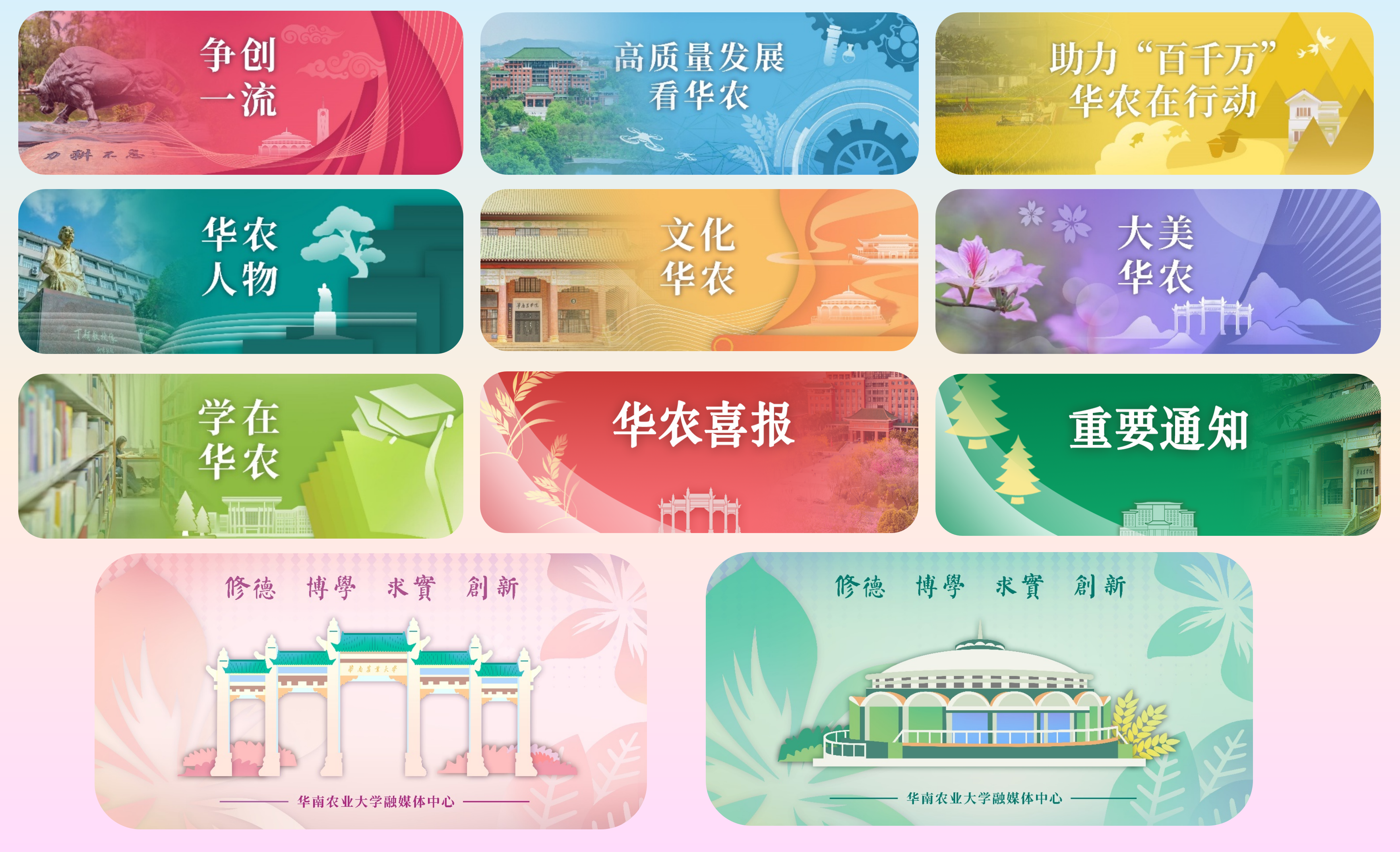 以全国高校重点建设思政类公众号为重点,学校融媒体中心聚力打造舆论传播与引领体系,不断创新宣传思路、加强选题策划,充分挖掘工作亮点和人物典型。推出“争创一流”“大美华农”“华农人物”等十多个品牌栏目,打造全景式华农人物图鉴,学者、学生、校友、后勤师傅的故事生动鲜活,多元化提升宣传工作吸引力感染力,筑牢网络育人高地。围绕学校“双一流”建设、服务“百千万工程”等持续滚动更新报道,及时宣传学校工作的创新举措、先进案例,营造干事创业的浓厚氛围,构建强农兴农的华农形象。