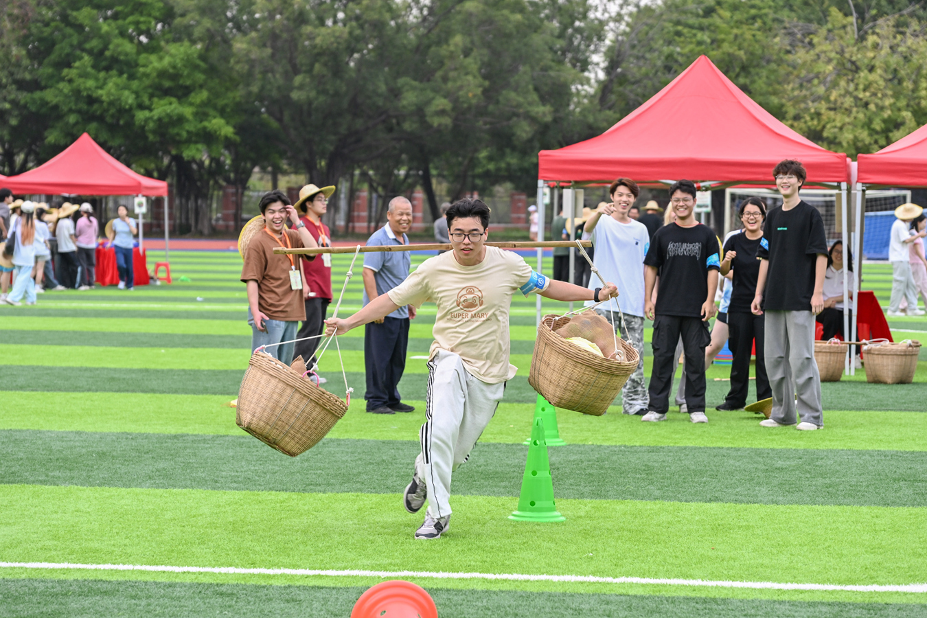 农耕文化趣味运动会现场,学子挑担过障