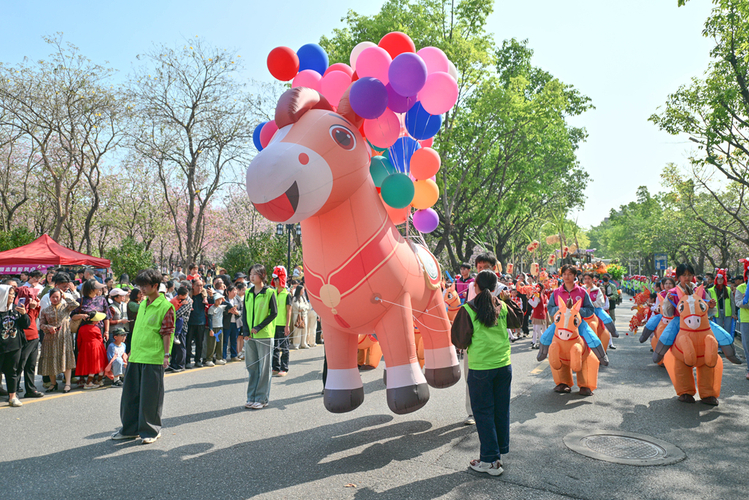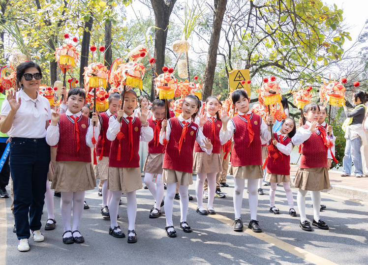 巡游路上,广州体育学院龙狮队腾跃起舞、领头前行,灵动小马造型气球方阵紧随其后,寓意龙马精神;粤剧表演团的小朋友们手持鳌鱼花灯穿行,古韵十足,华农南蓁汉服社同学手执南沙黑皮果蔗,蔗头挂着竹笼,寓意“揸住碌竹、掂过碌蔗”;华农龙狮团、军事爱好者协会、无人机协会、太极拳社团、轮滑社团依次亮相,青春气息满满;萌宠团队携猫猫狗狗可爱登场,引得沿途师生、市民纷纷驻足拍照、互动打卡。