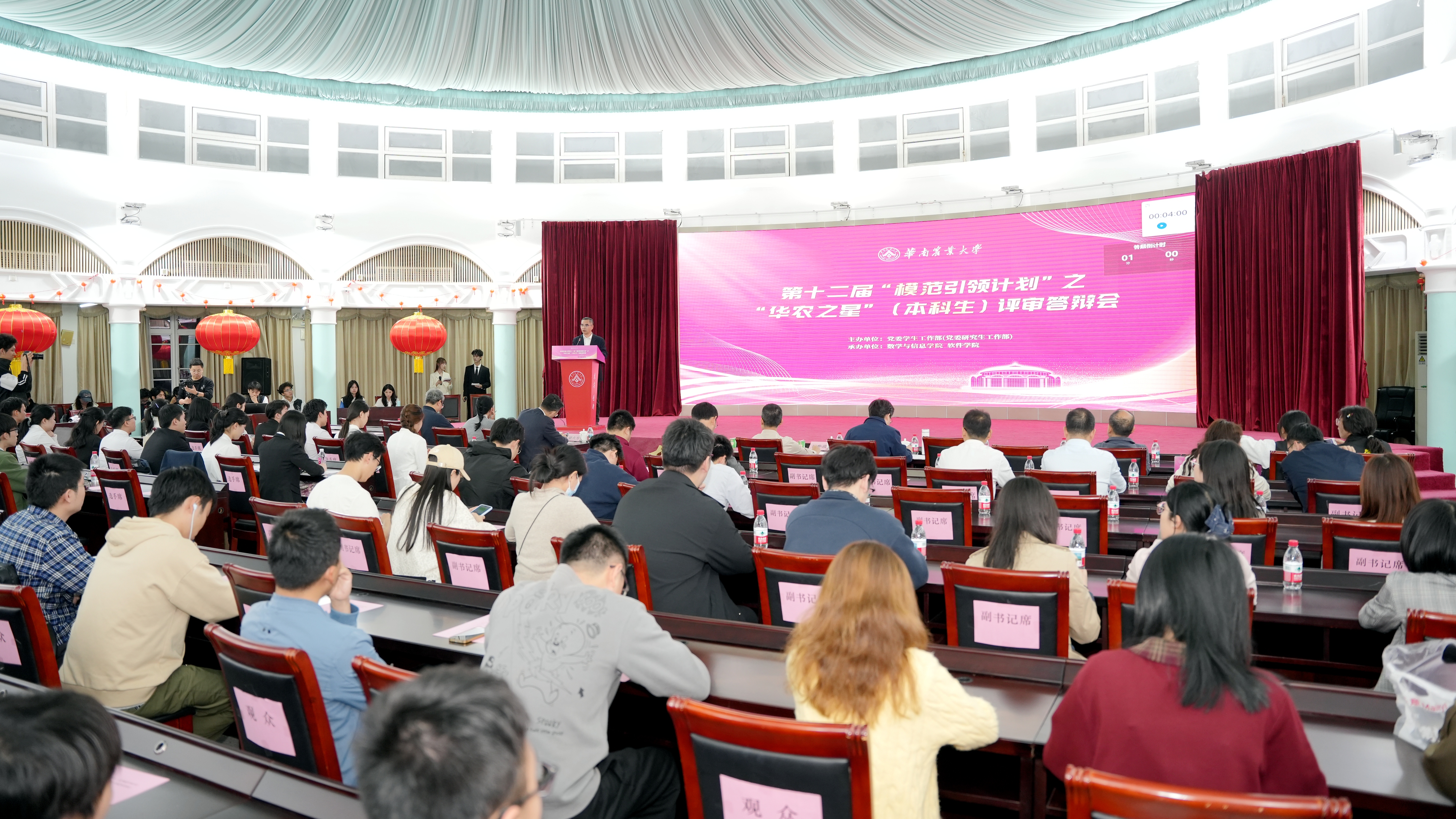 近日,学校第十二届“模范引领计划”之“华农之星”本科生评审答辩会在红满堂报告厅圆满举行。副校长陈乐天出席活动并致辞。本次活动以“厚植三农情怀,争当强国一代”为主题,采用网络投票+现场评审答辩模式,同步开启云端直播。来自全校各学院的22位本科生候选人,通过个人风采展示、即兴答题环节同台竞技,全方位展现了华农青年知农爱农、挺膺担当的青春风貌。