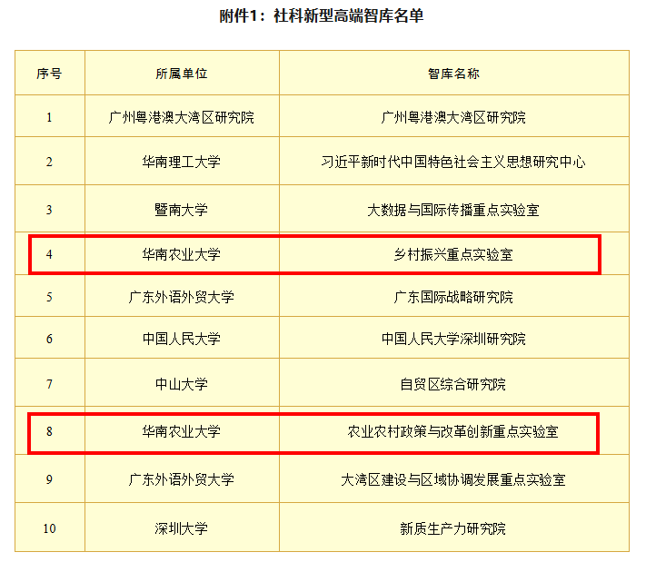 近日,广东省社会科学界联合会公布社科新型高端智库名单,全省共评审出10家社科新型高端智库,华农乡村振兴重点实验室、农业农村政策与改革创新实验室入选。