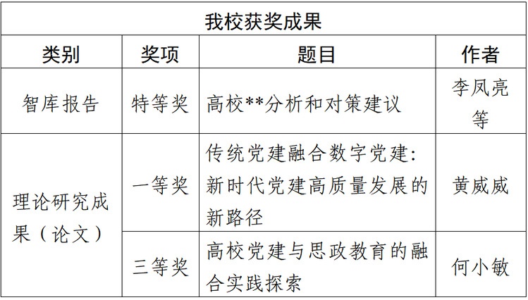近日,广东省高等学校党的建设研究会公布了广东省高校党建研究优秀成果奖获奖名单,我校获评智库报告特等奖1项,理论研究成果一等奖1项、三等奖1项,获奖数量位居全省高校前列,学校在评选活动中荣获优秀组织奖。
